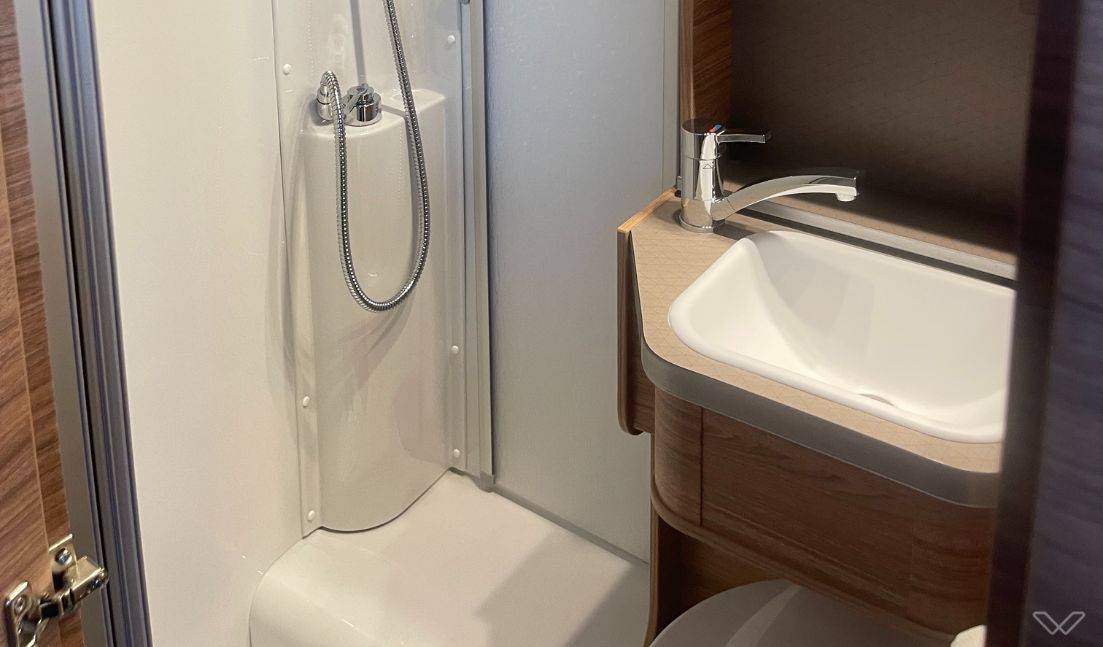 Voll ausgestattete Stehküche: Die Küche verfügt über ein Dreifach-Gaskochfeld mit Glasabdeckung, ein großes Edelstahlspülbecken und einen 142-Liter-Kühlschrank mit automatischer Energiewahl (AES), der auch unabhängig von der 230V-Versorgung arbeitet.