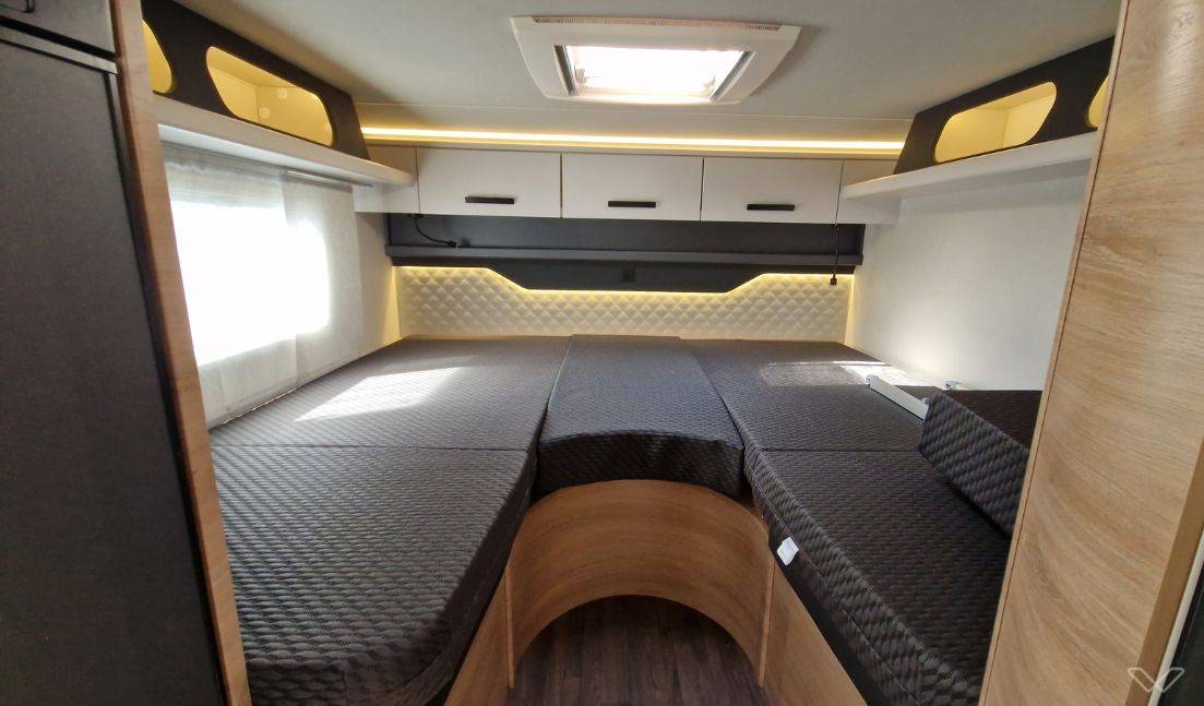 Zwei feste Einzelbetten: Im Heck findest du zwei separate Einzelbetten (je 200 x 82 cm), die eine unkomplizierte Schlafgelegenheit für zwei Personen bieten.