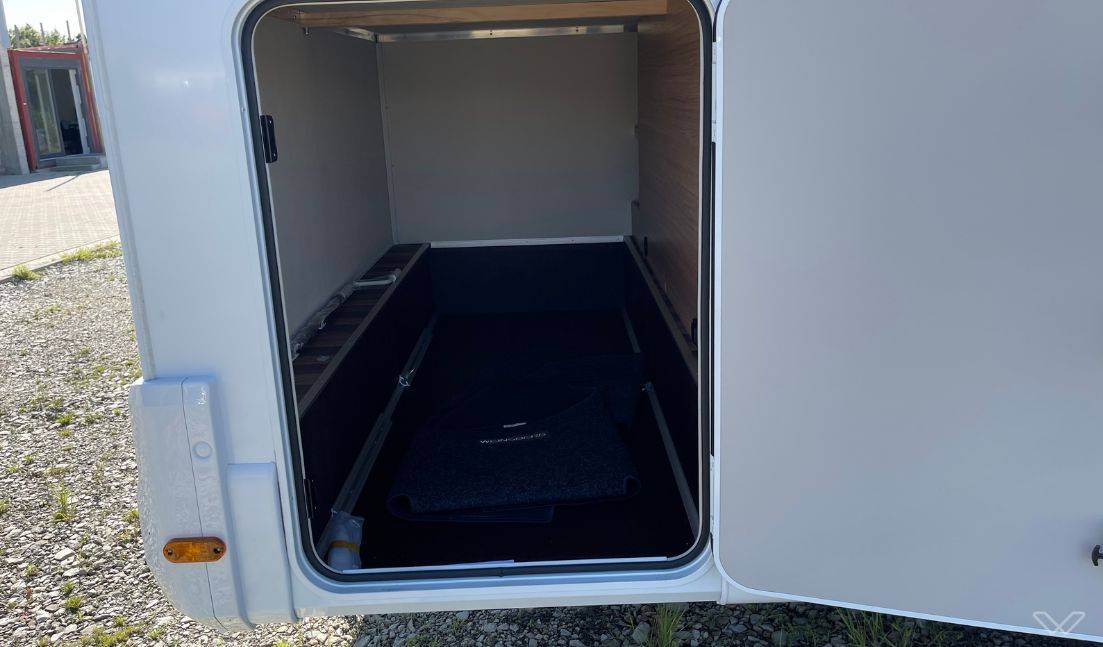 Praktischer Stauraum: Neben zahlreichen belüfteten Stauschränken bietet das Fahrzeug eine große Heckgarage (Traglast 150 kg) und die optionale WEINSBERG Easy-Travel-Box für Gepäck, Outdoor-Ausrüstung oder Fahrräder.