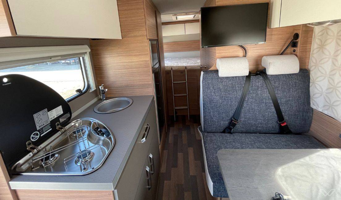 Flexible Sitzgruppe: Die Mittelsitzgruppe (Doppeldinette) mit ausziehbarer Tischplatte und drehbaren Fahrersitzen schafft einen gemütlichen Aufenthaltsbereich für alle.