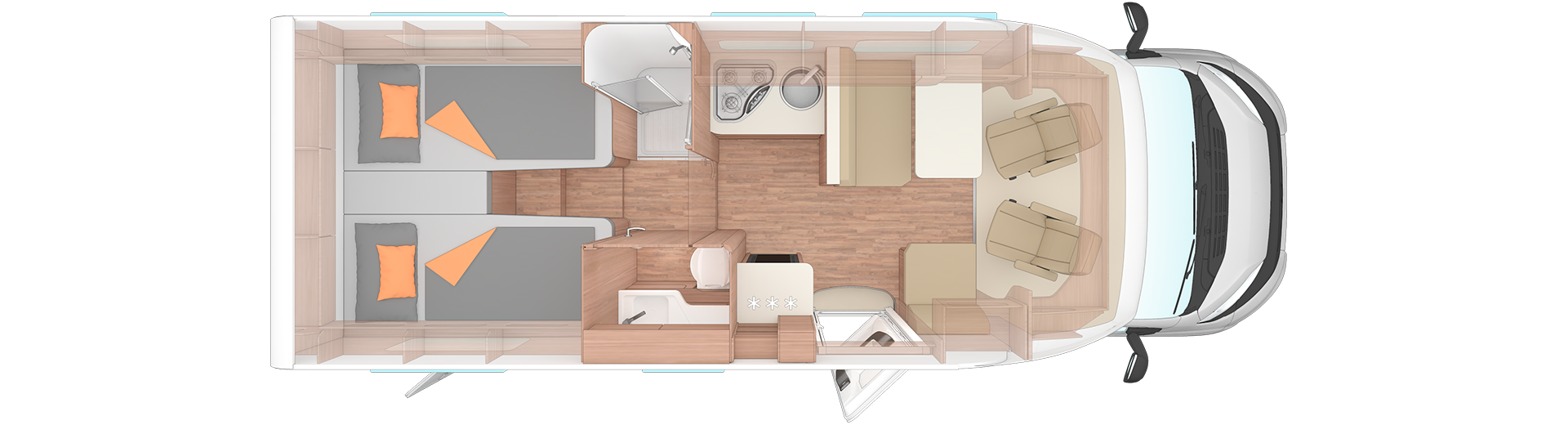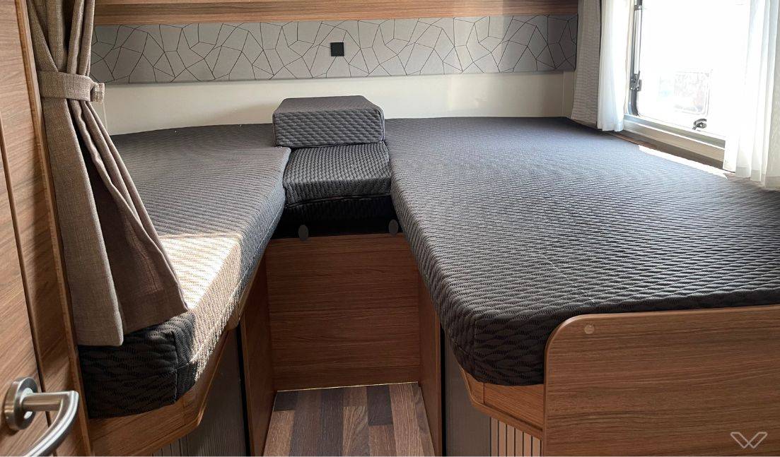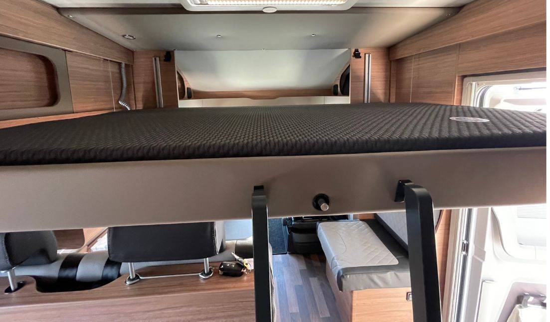Vier feste Schlafplätze: Der CaraSuite bietet zwei separate Schlafbereiche: Ein festes Doppelbett im Heck (210 x 135/123 cm) und ein elektrisches Hubbett (192 x 140/120 cm), das bei Bedarf platzsparend in der Höhe verschwindet.