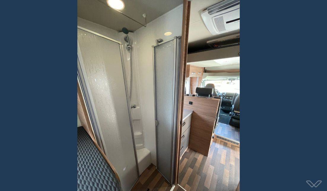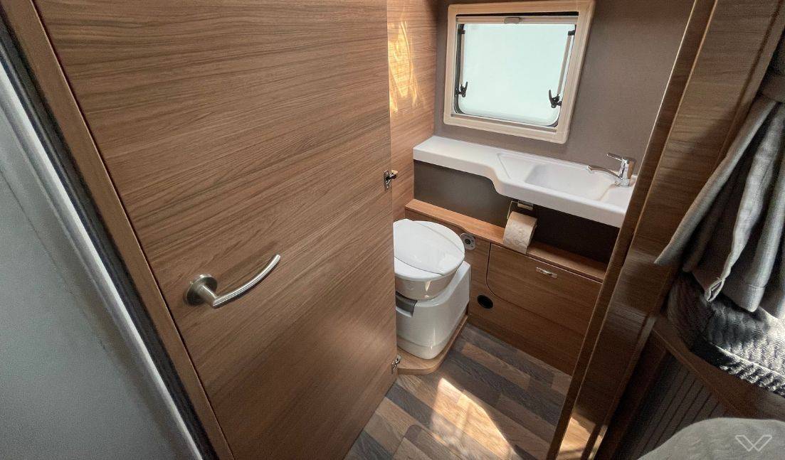 Separates Badezimmer: Das Fahrzeug verfügt über ein Bad mit einer separaten Duschkabine und einer drehbaren elektrischen Kassetten-Toilette.