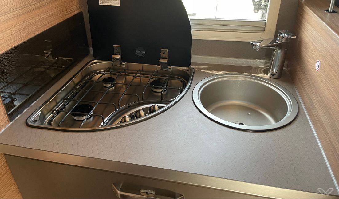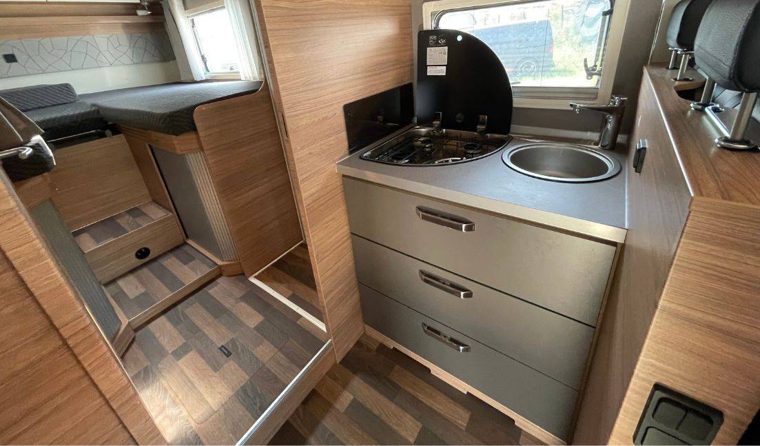 Voll ausgestattete Hochküche: Die Küchenzeile verfügt über ein Dreiflammenkocher mit Glasabdeckung, ein integriertes Spülbecken und einen großen 133-Liter-Kühlschrank inklusive Gefrierfach.