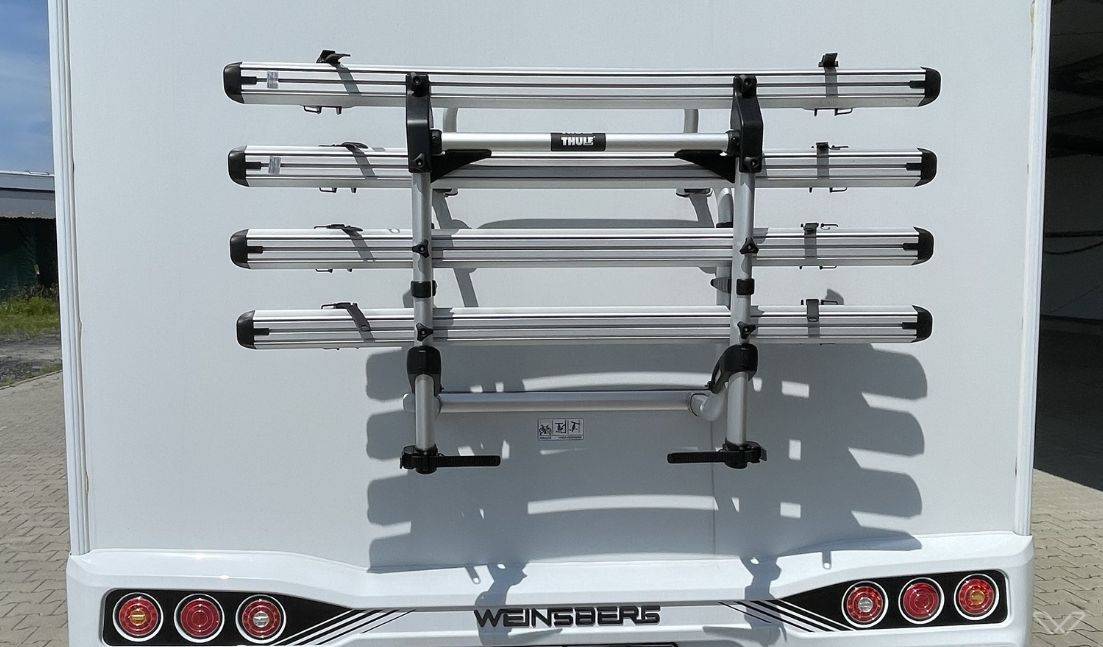 Intelligenter Stauraum: Eine riesige, beidseitig zugängliche Heckgarage und zahlreiche Schränke bieten viel Platz für Gepäck. Der Fahrradträger für 4 Räder ist serienmäßig.